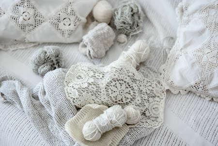 Beautiful knitted pattern close-up. Lace knitted fabric made of white thread. Handmade items. The texture is knitted from threads.