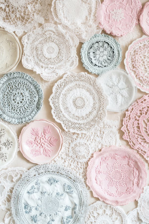 Illustration of a collection of vintage lace doilies arranged in a circular pattern, with soft pastel colors and intricate floral embroidery details. The delicate and romantic design evokes nostalgia and timeless beauty.