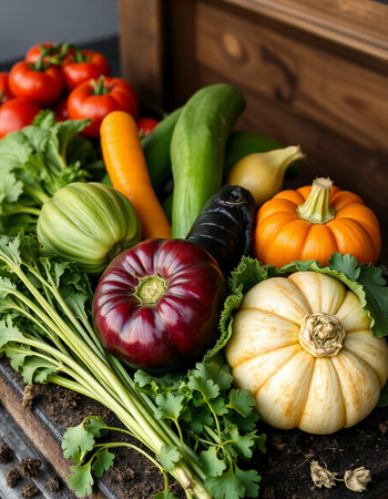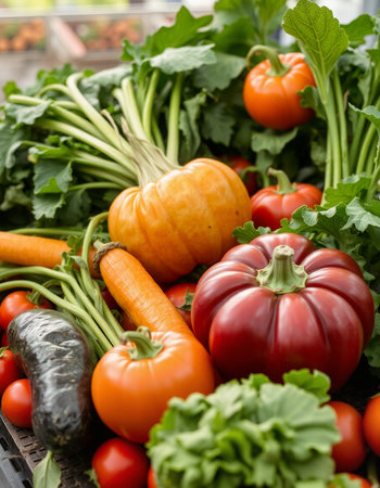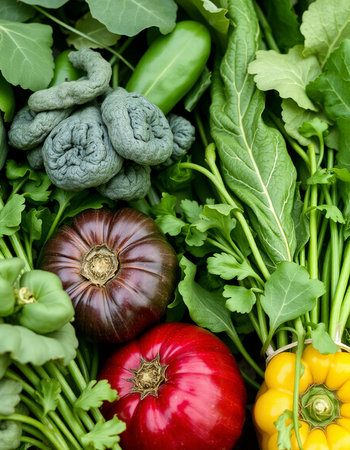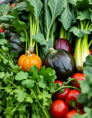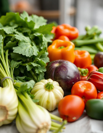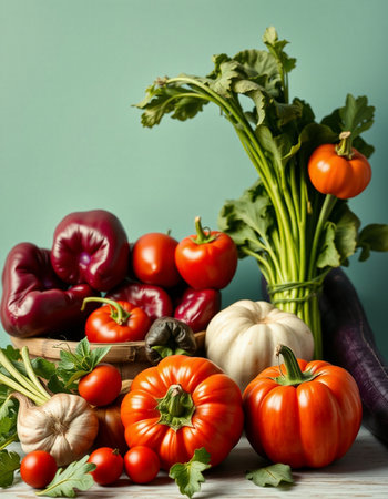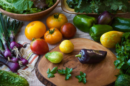 Variety of fresh organic vegetables including tomatoes, peppers, cucumbers, peppers and parsley