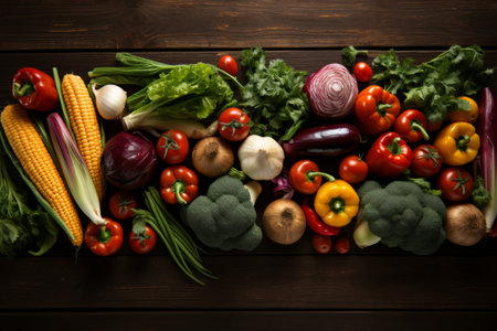 Variety of fresh vegetables on rustic kitchen table. Top view