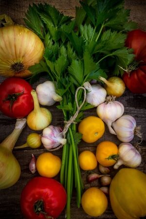 Natural farm vegetables garlic, onions, tomatoes, greens