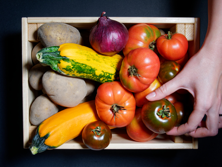 Hand of a young woman holding a fresh tomato in a box of fresh vegetables. Top view, flat lay