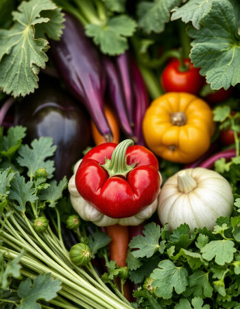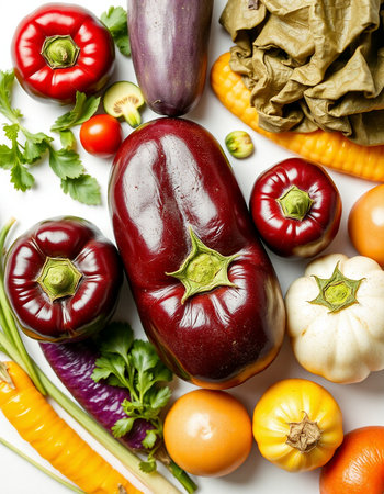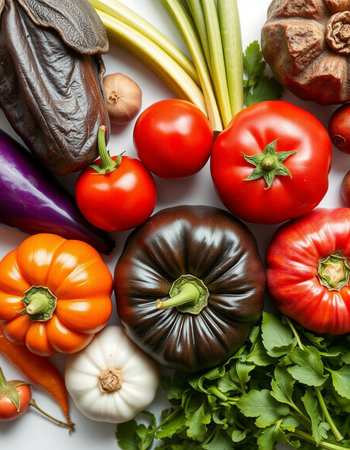 Variety of fresh organic vegetables including eggplant, tomato, cucumber, pepper, garlic and parsley