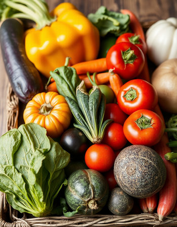 Fresh organic vegetables in a basket on a wooden table. Selective focus.