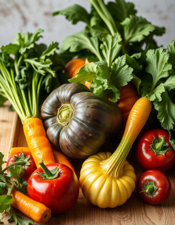 Fresh organic vegetables on wooden table. Healthy food concept. Selective focus