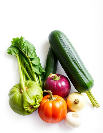 Fresh vegetables isolated on white background. Zucchini, tomato, pepper, onion, garlic