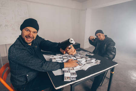 Two stealers are sitting in the room full of money, and having fun with weapon