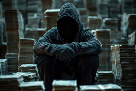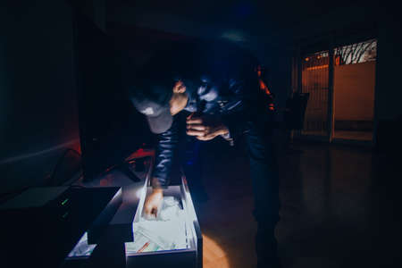 Masked burglar reaching into a safe to take a bill in a shadowy environment