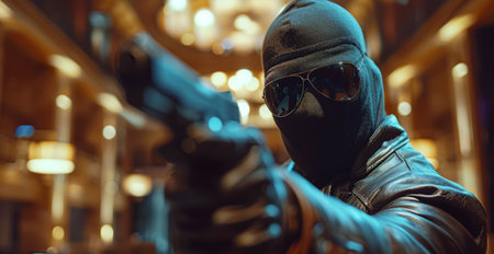 A person wearing a mask and sunglasses aims a gun in an indoor setting.
