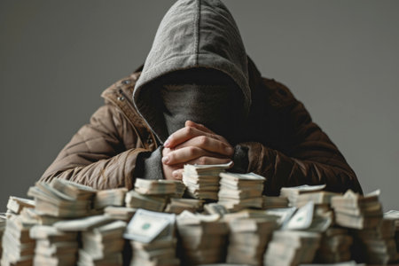 Thief in balaclava and gloves stealing money from a wallet. Criminal act of bank robbery or financial fraud concept.