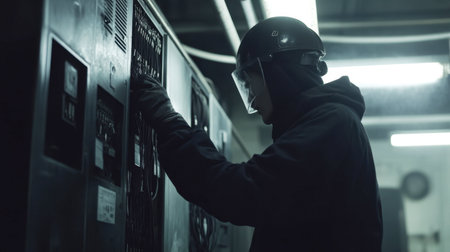 A technician wearing a helmet and gloves works on electrical equipment in a dimly lit industrial environment, showcasing focus and safety in maintenance operations.