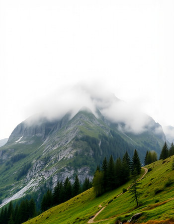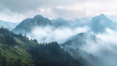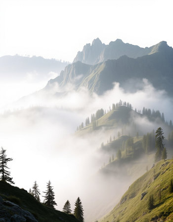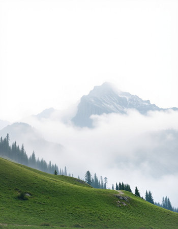 Discover a breathtaking mountain landscape shrouded in fog, with lush forests ascending into the clouds, creating a serene and tranquil atmosphere perfect for nature lovers.