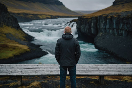 A man in a black jacket and jeans stands on the edge of the cliff and looks at the waterfall. Iceland.