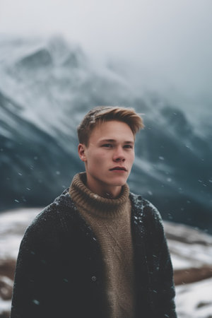 a man is far away, standing with his back against the backdrop of the huge mountains in Lofoten. cold colors
