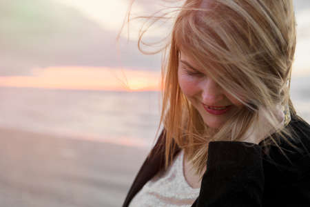 Long hair of a young girl against the sea beach and sunset background.
