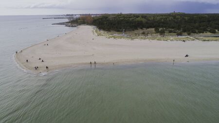 A beach by the sea in Central Europe. Coastline seen from afar. Autumn season.