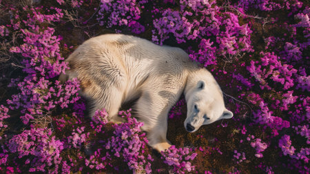 Majestic polar bear peacefully sleeping amongst vibrant purple flowers in the vast Arctic tundra