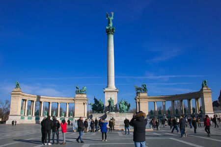 BUDAPEST, HUNGARY - MARCH 2020. Heroes Square monument and tourist in Budapest city.