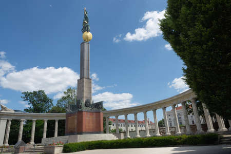 Vienna, Austria - June 2022: The Soviet War Memorial in Vienna (Denkmal zu Ehren der Soldaten der Sowjetarmee Hochstrahlbrunnen) constructed in 1945, commemorating Soviet soldiers killed during WWII