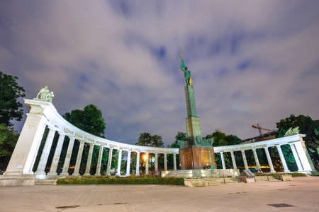 Vienna, Austria, October 13, 2016: Night view of War Memorial - Heroes Monument of Red Army on Schwarzenbergplatz in Vienna, Austria. Memorial with Red Army Soldier was unveiled in 1945