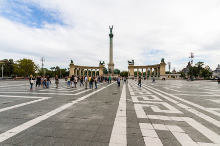 Budapest, Hungary – Tourists at Heroes Square in Budapest Hungary wide angle, landscape on September 17 2019 in Hungary