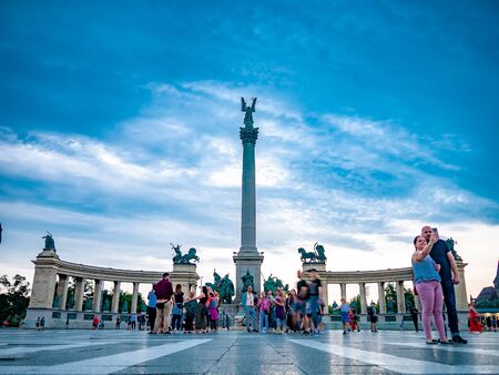BUDAPEST, HUNGARY - JUNE 22, 2019: View on the tourists on the Heroes Square in Budapest, Hungary on a cloudy day during sunset.