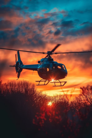 sunset, dramatic sky and silhouettes of helicopter in nature.