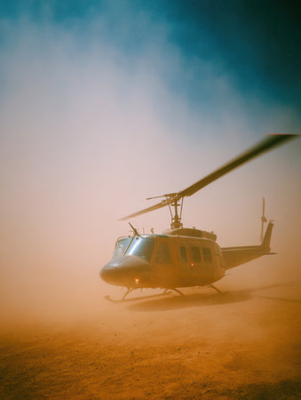 A helicopter lifts off from a dusty terrain, stirring up clouds of dust as it ascends against a backdrop of a vivid blue sky and setting sun.