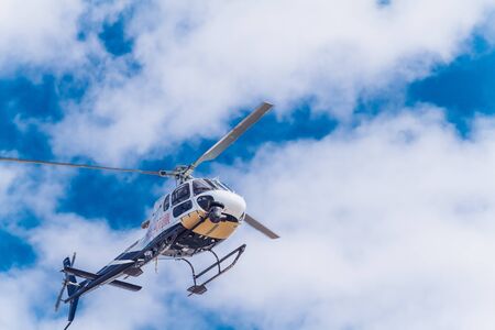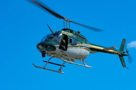 Sheriff Helicopter Hovering on a Beautiful Sky Background. Sheriff Department helicopter on a routine surveillance mission in Santa Monica. Los Angeles, California, USA. March 22nd, 2021