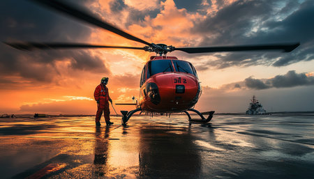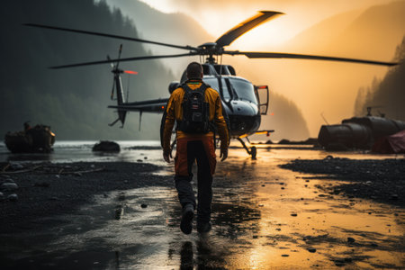 A pilot in full gear walks towards a helicopter, ready to embark on a daring rescue mission. Generative AI
