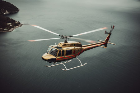 Helicopter flying in the sky over the sea, aerial view