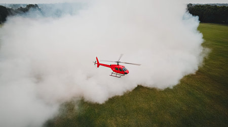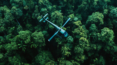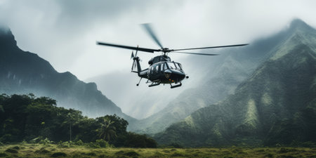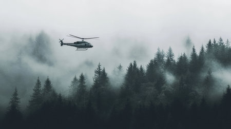 A helicopter fly in air with high mountain fog and rainforest. Outdoor travel concept. AI generated.