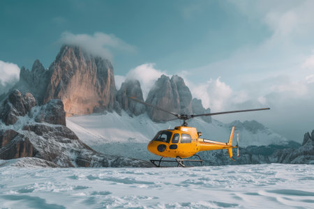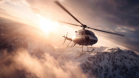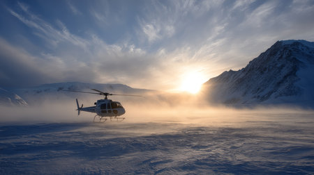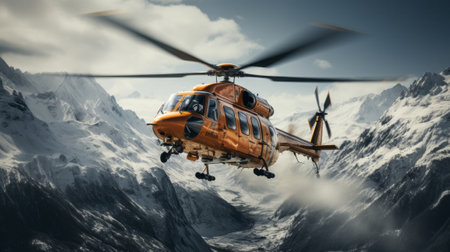 A helicopter flying over a snowy mountain. Generative AI.