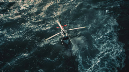 a maritime search and rescue operation. After an accident, a rescue chopper searches the water's surface for casualties. The Generative AI