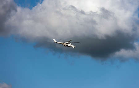 White attack helicopter of the United Nations peacekeeping mission in flight against the background of dark cloud. The profile of light helicopter in the blue sky under rain cloud.