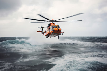 Search and rescue operation in sea. Emergency rescue helicopter flies over sea surface, looking for victims after crash. Generative AI