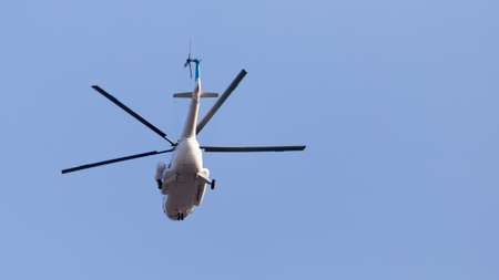 Silhouette of big helicopter overhead on background of overcast blue sky in faded tones. Aerial tourism. Rescue mission. Air ambulance. Emergency evacuation.