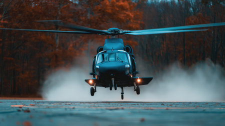 A striking black helicopter lifts off from a dusty area against a backdrop of autumn trees, showcasing dynamic movement and technological prowess in aviation.