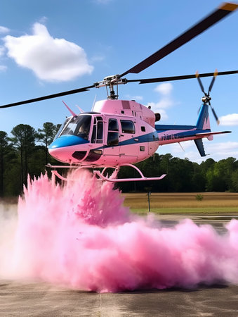 Helicopter with pink smoke and blue sky background. 3d rendering