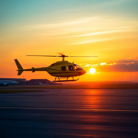 Helicopter landing on runway at sunset. Helicopter taking off