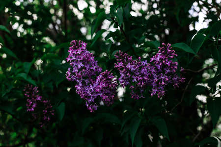 beautiful purple lilac among the green leaves on the bush in the spring garden
