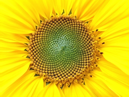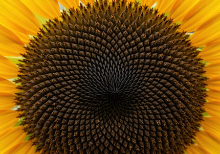 Intricate geometric spiral pattern of a sunflower central seed head, showcasing the detailed arrangement of dark brown seeds and vibrant yellow petals. focus on nature mathematical beauty and organic texture.