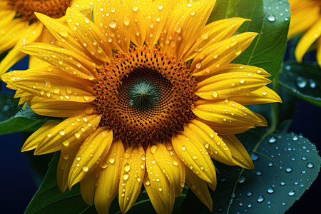 Sunflower covered in water drops. Closeup shot. Ai Generative