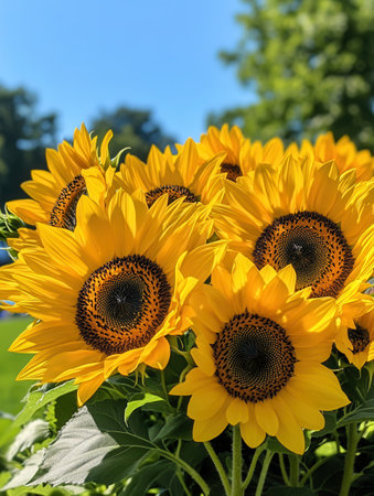 Bright sunflowers radiate happiness under the warm sun, set against a clear blue sky, creating a cheerful atmosphere.