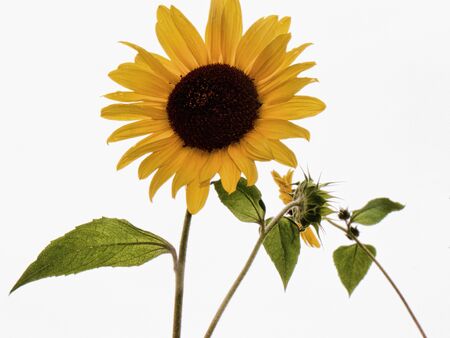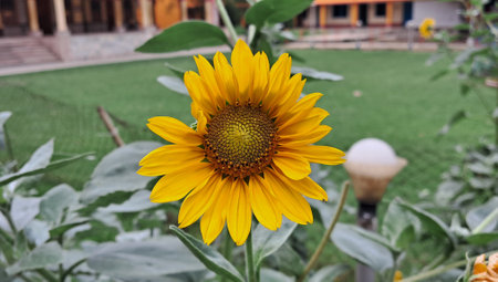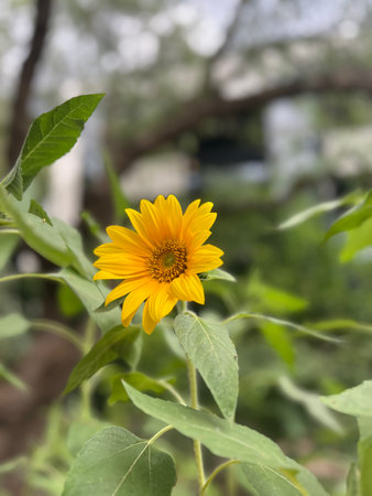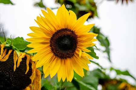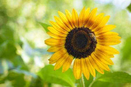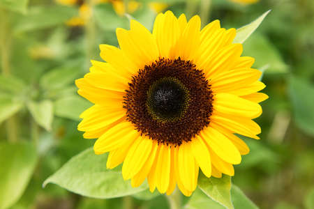 Yellow sunflower in the garden with green leaves. (Helianthus annuus)