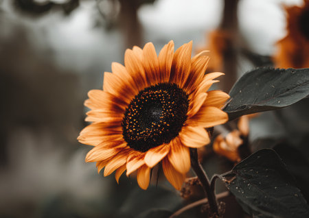 A close-up shot captures a sunflower with radiating orange petals and a dark center, showcasing a detailed texture. The composition utilizes a shallow depth of field, with a blurred background. The image evokes feelings of warmth. Suitable for botanical illustrations and natural themes.