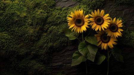 Bright sunflowers stand out against textured mossy background, creating vibrant and natural composition. contrast between yellow petals and green moss evokes sense of freshness and tranquility