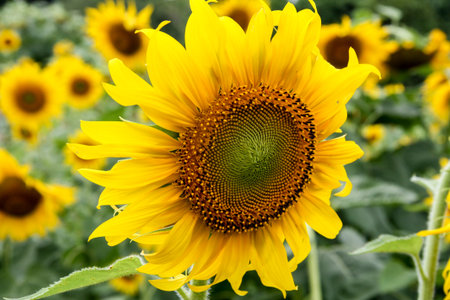 Close-up of a bright sunflower with a backdrop of a flourishing sunflower field