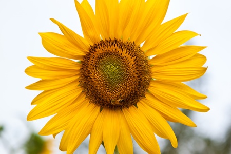 Sunflower in the field with blue sky background. (Helianthus annuus)