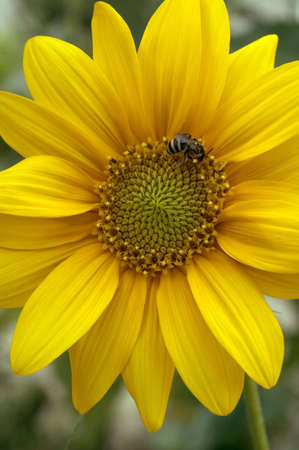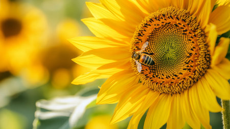 A close-up of a single sunflower with a bee collecting nectar, showcasing the intricate details of the flower's petals and its role in the ecosystem.